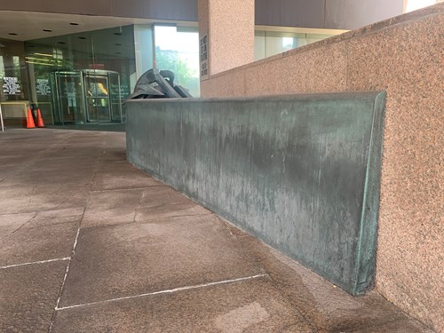 Sentimental Scale & Wedge is two separate metal pieces: one is freestanding and upright with a sloping four-sided base exploding into a curvilinear mass on top; the second is a horizontal rectangular piece sitting flush against the wall which begins at two inches thick and grows as it wraps around the building's corner, bursting into another mass of curves.