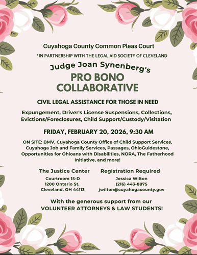 The Pro Bono Program provides help in civil matters to defendants who are facing criminal charges in the Court. Many of the clients are currently on one of the Court's specialty dockets. Attorneys volunteer their time to help with matters such as housing, child custody, and finances. Registration is required by emailing Jessica Wilton at jwilton@cuyahogacounty.gov or calling 216-443-8875.