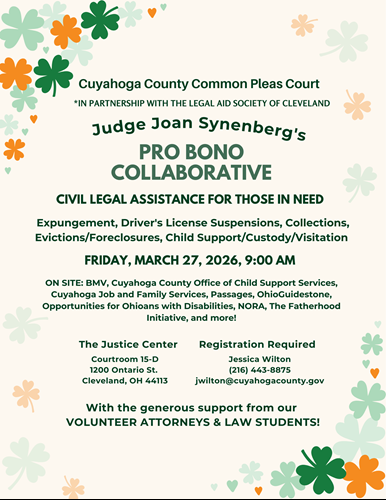 The Pro Bono Program provides help in civil matters to defendants who are facing criminal charges in the Court. Many of the clients are currently on one of the Court's specialty dockets. Attorneys volunteer their time to help with matters such as housing, child custody, and finances. Registration is required by emailing Jessica Wilton at jwilton@cuyahogacounty.gov or calling 216-443-8875.
