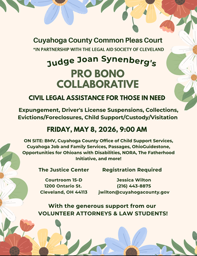 The Pro Bono Program provides help in civil matters to defendants who are facing criminal charges in the Court. Many of the clients are currently on one of the Court's specialty dockets. Attorneys volunteer their time to help with matters such as housing, child custody, and finances. Registration is required by emailing Jessica Wilton at jwilton@cuyahogacounty.gov or calling 216-443-8875.